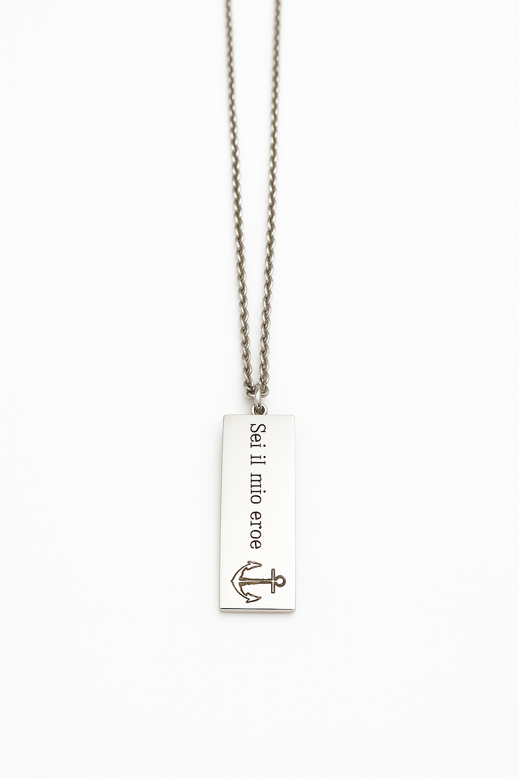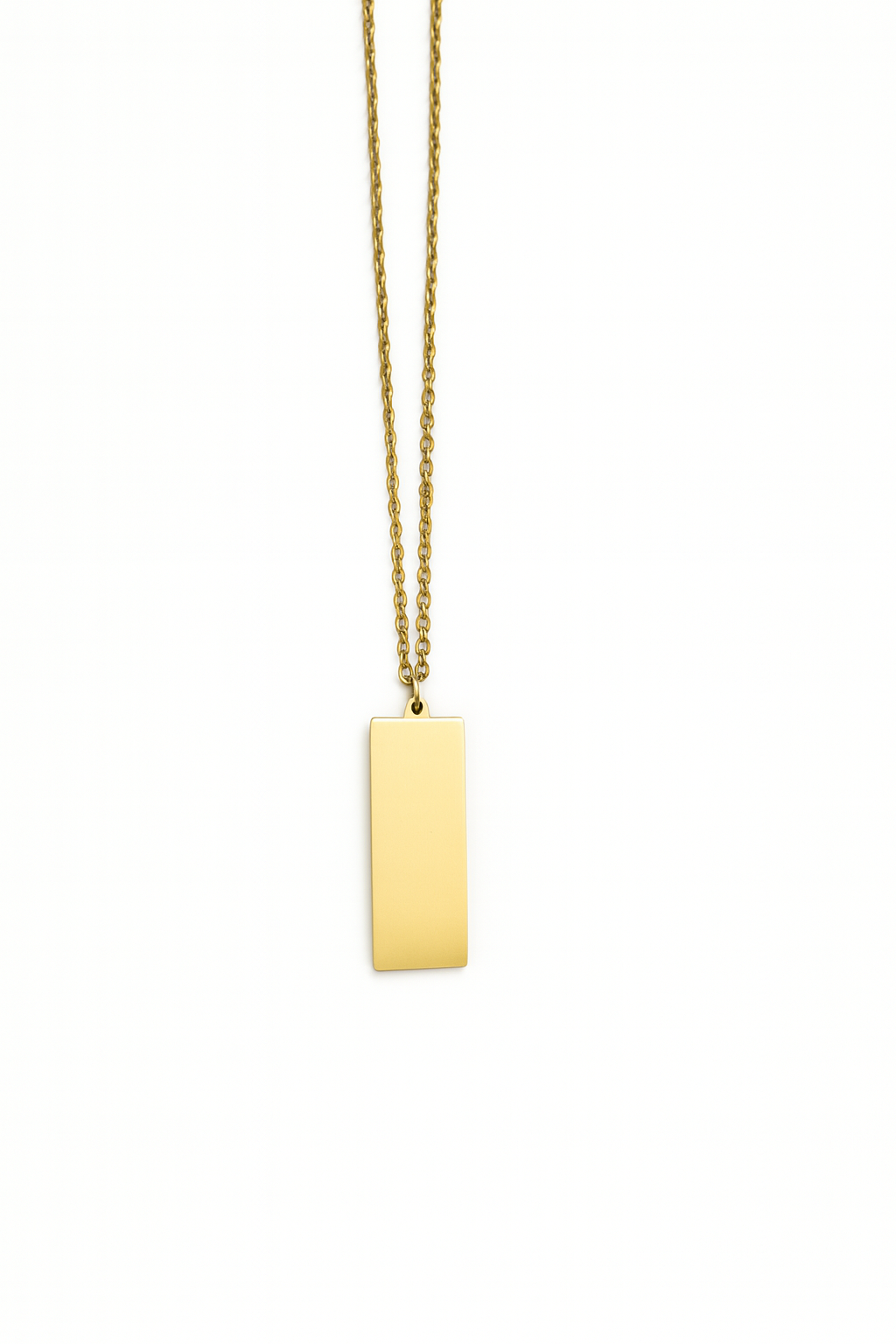 Thin chain base necklace with unisex rectangle pendant.