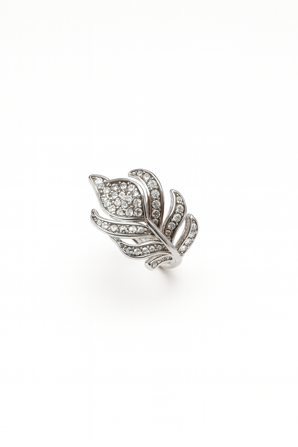 Anello a fascia con foglia pavè e zirconi bianchi.