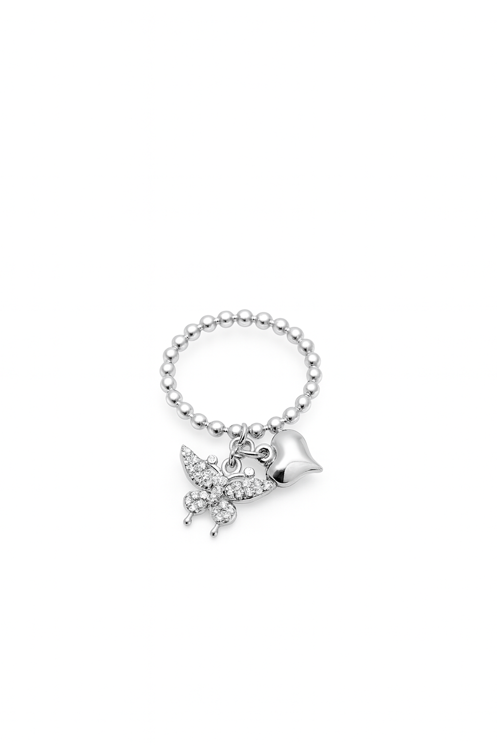 Anello a base sottile con texture a pallini e ciondolo farfalla zirconata e cuore sonaglio.