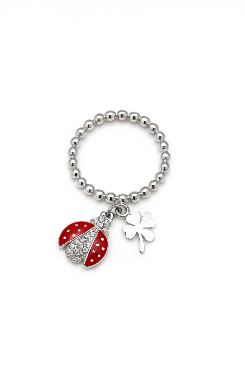 Anello a base sottile con texture a pallini e ciondoli coccinella e quadrifoglio.