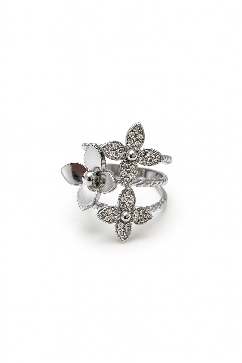Anello a tre fili regolabile con 3 fiori, 2 zirconati e un liscio più grande.